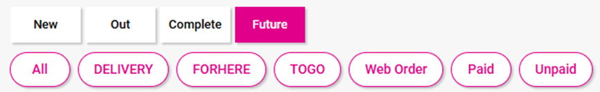 Order types that display on the Future tab are For Here, To Go, Delivery and Web Orders that were marked for Later (In-Store) or Future (Online).