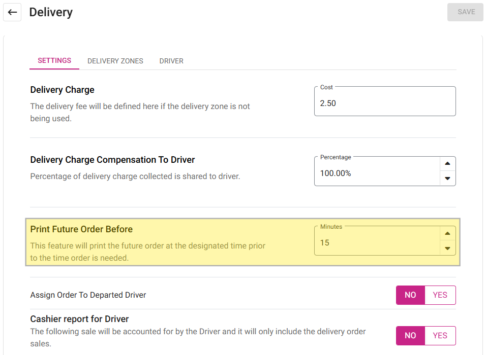Back Office Navigation: Log into BO then for your Store select Settings > Application > Delivery On the Delivery Settings page: under the Settings tab, the Print Future Orders Before is for establishing a set Time (in Minutes) to print the Order in ...