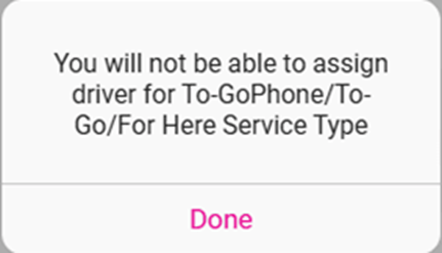 When you select a Phone To Go Order then try to select a Driver, the alert message 'You will not be able to assign driver for To-G0 Phone/To-Go/For Here Service Type' appears.