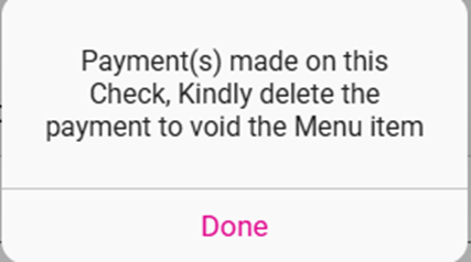 - If there is a payment on the Order, the Check will open to the Payment screen and the error message 'Payment(s) made on this Check, Kindly delete the payment to void the Menu Item' appears.