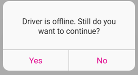 If the Driver is not clocked-in, the message 'Driver is offline. Still do you want to continue?' will appear. Click Yes to assign to that Driver anyway. Click No to cancel the Driver assignment and select a different driver.
