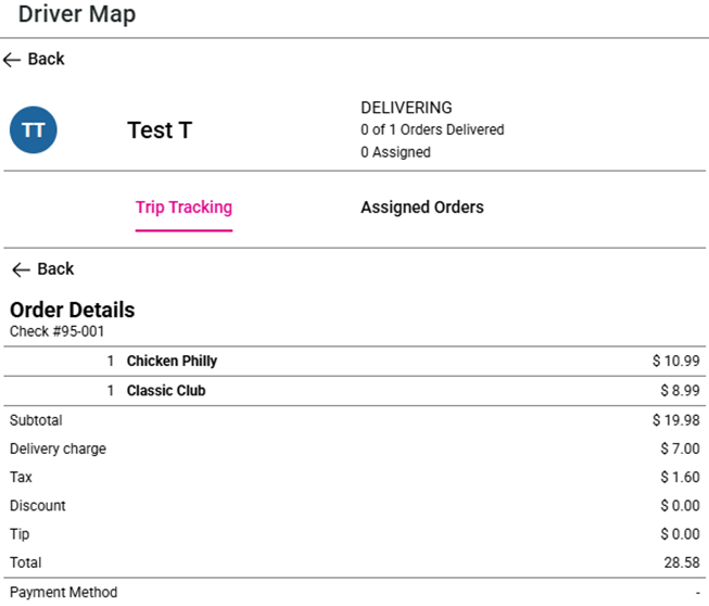 Note:If the Assign Order to Departed Driver toggle is enabled in the Back Office: when a Check is assigned to a Driver, the respective Driver will appear in the Delivering section. This will also allow for the assigning of new orders even when the driver is out on a Delivery.