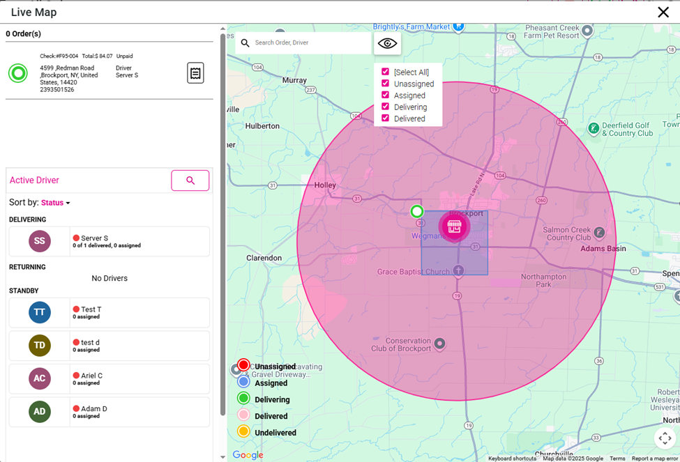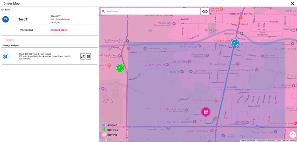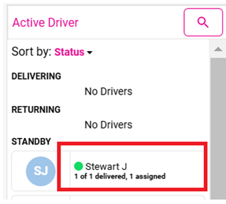Driver Status: Displays the assigned Drivers status; Standby or Delivering. If using Driver App, Returning will also be an option.