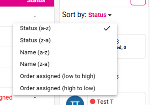 Order Assigned (low-high): Sorts all drivers based on number of orders currently assigned from low to high. If drivers have the same numbers, they are then sorted by names alphabetically. Removes the statuses from view when using this sort.
