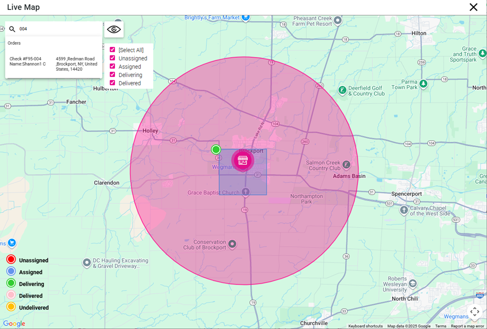 You can also search for and select Orders via the Live Map. The live map will display programmed zones and dots for delivery orders. The store icon in the middle is the restaurant. There is a color key for the dots in the bottom left of the map.