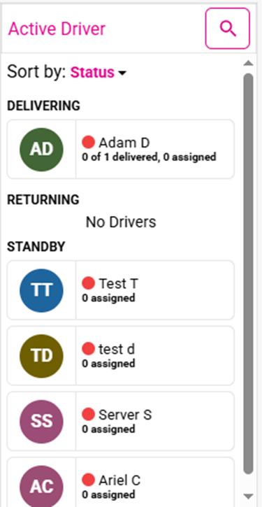 Status (a-z) (default view): Sorts the driver’s statuses, Delivering, Returning, and Standby alphabetically