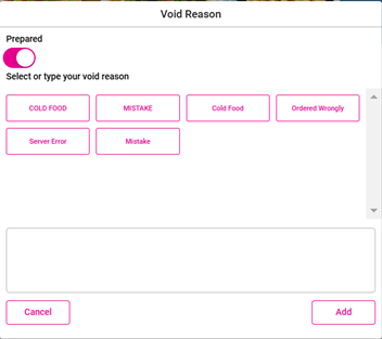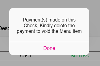 Cancel Order: Select the Order then click Cancel Order. If payment was made on the Order, the Order will open to the payment screen with a message 'Payment(s) made on this Check, Kindly delete the payment to void the Menu Item'. Delete the payment to void/cancel the Order. If no payment was made on the Order, the Void screen will appear. After selecting/entering a Void Reason, the Check will be voided.