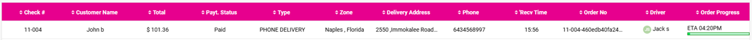Order Progress: Indicates the ETA (Estimated Time of Arrival) in HH:MM AM/PM format. Available only to those using the Driver app.