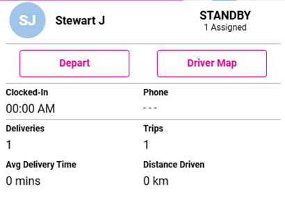 If the Driver has orders assigned to them, the Depart button will be pink and can be clicked to depart the Driver which moves the assigned Order(s) to the Out tab. If the Driver does not have Orders assigned to them the button will be greyed out.