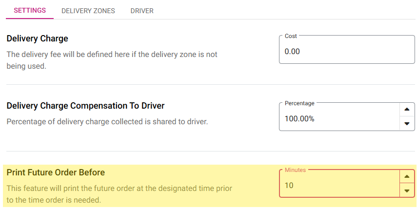 On the Delivery Settings page: under the Settings tab, the Print Future Orders Before is for establishing a set Time (in Minutes) to print the Order in advance prior to needing it. Enter the number or use the arrows to increase/decrease the value.