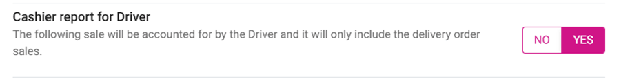 Back Office Navigation: Log into BO, select a Store, then navigate to Settings > Application > Delivery If the toggle is enabled (set as YES), the Sale will be assigned to the Driver and will only include Sales from Delivery Orders. Those Order Sales ...