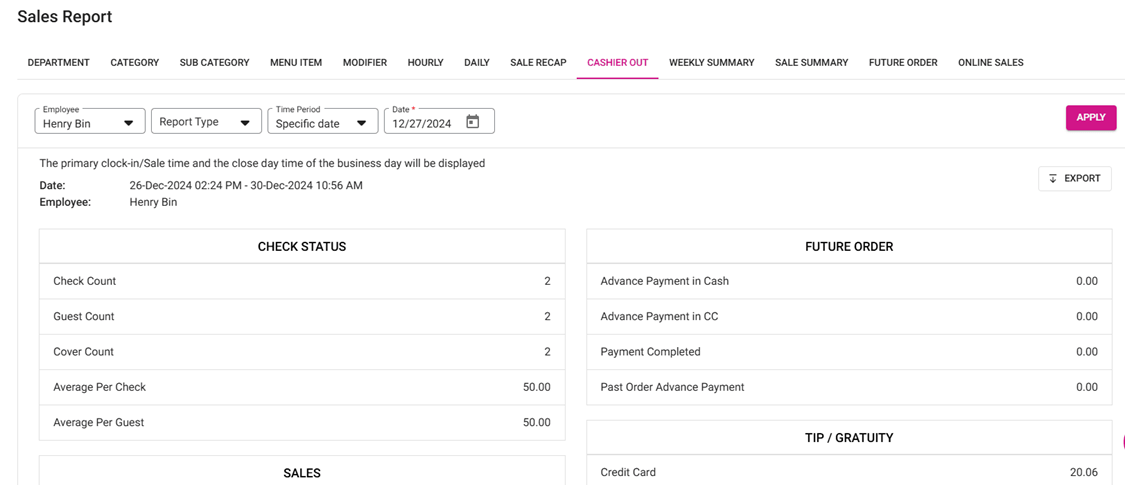 Cashier Out Report