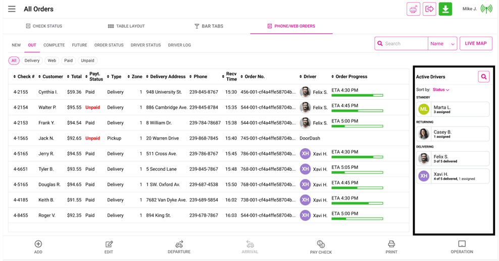 Navigation Navigating to the Phone/Web Orders Tab Delivery From the Log In screen, click the Delivery button. Enter your PIN then click Continue. The Phone/Web Orders screen appears on the New tab with the Delivery filter enabled. Phone Order From ...
