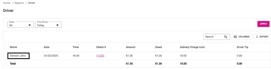 When the Cashier report for Driver toggle is enabled in Back Office Settings, the name of the Driver assigned to each particular Check will appear.
