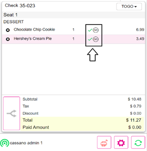 The Order will be finalized and sent to the Kitchen to be prepared. A green check mark ✔ will appear on the Order screen, denoting that the details have been sent to the Kitchen.
