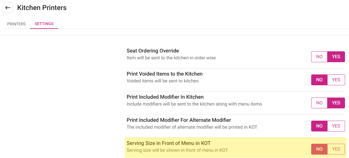 When Serving Size In Front of Menu in KOT toggle is set as Yes (Enabled) in BO, the Serving Size will appear in front of the Menu Item in Kitchen Receipt print, KDS and Order screen.