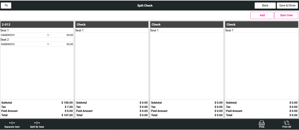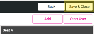 When you select Save & Close at the upper-right: any changes made on the Split Seat screen will be saved, and you are taken to the Order screen.