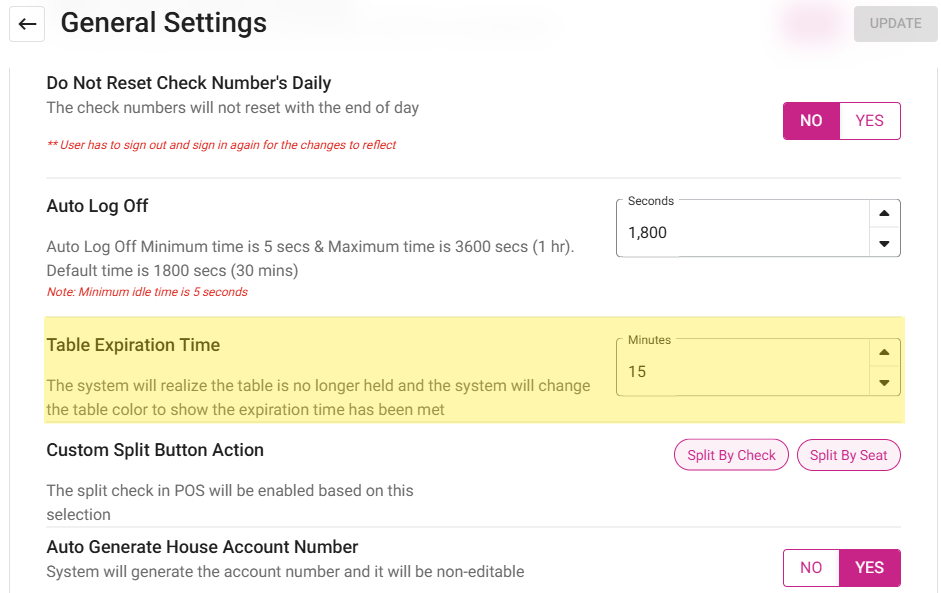 On the General Settings page: enter the Table Expiration Time (in Minutes) based on the needs of the Store. This will serve as the threshold for how long a Table can be held.