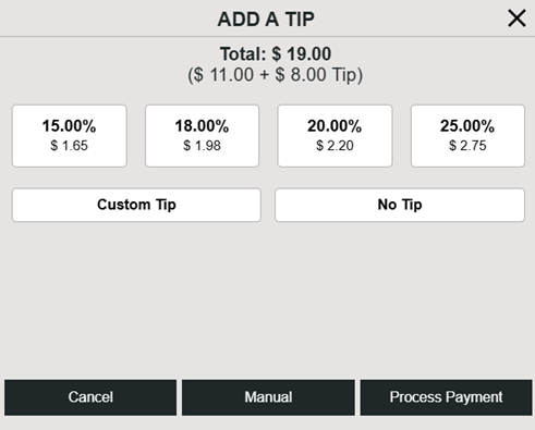 When the Tip Amount is more than the value entered in the field: a Manager's approval will be requested in POS. Only numbers will be allowed in this field.