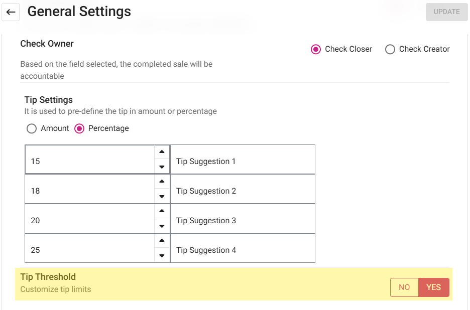 On the General Settings page: ensure the Tip Threshold toggle is enabled (set to YES). If enabled, when the Tip amount is more than the Sale amount then Manager approval will be requested.