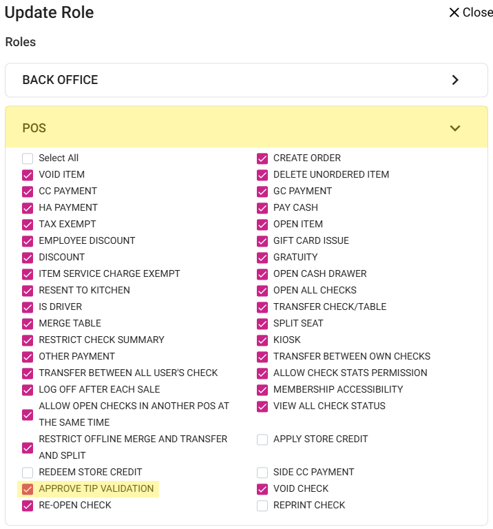 Enable the toggle by selecting the corresponding checkbox. The Role will be able to approve any Tip amount that has surpassed Threshold settings.