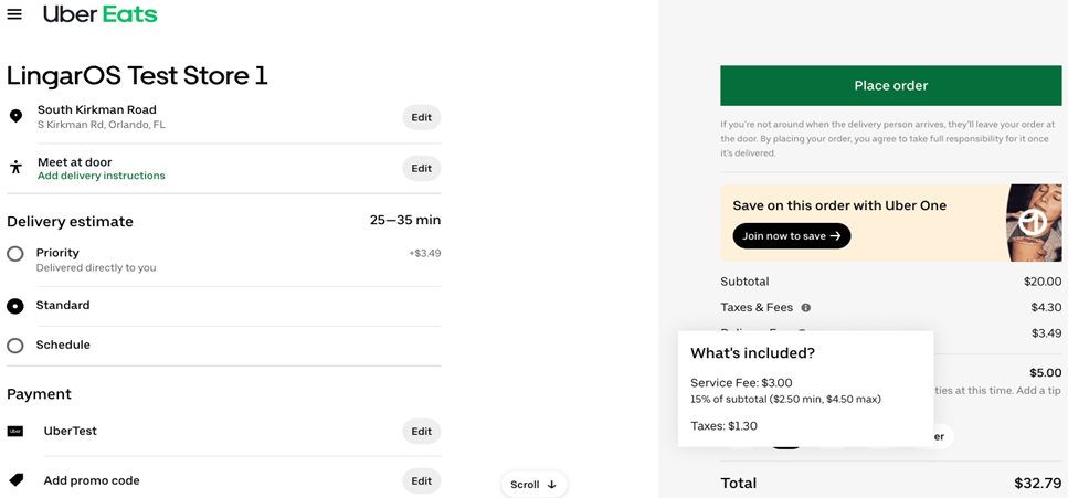 Example: If a menu item has tax, then 15% of the sub total will be calculated as Taxes and Fees on the Uber side wherein 15% will be the Service Fee which will be taken by UE and the actual Tax for that menu item $1.30 will be send to us.