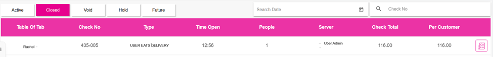 Once an Order is placed from Uber Eats, the message ‘You have 1 online order’ appears in POS. The Check will be listed under the Active tab within the Check Stats section.