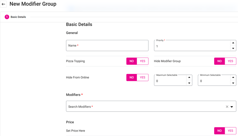If the Urban Piper license is enabled, the options Maximum Selectable and Minimum Selectable will be included with Modifier Group - where you can enter the values for those fields.