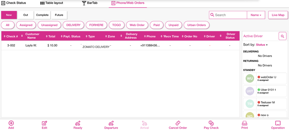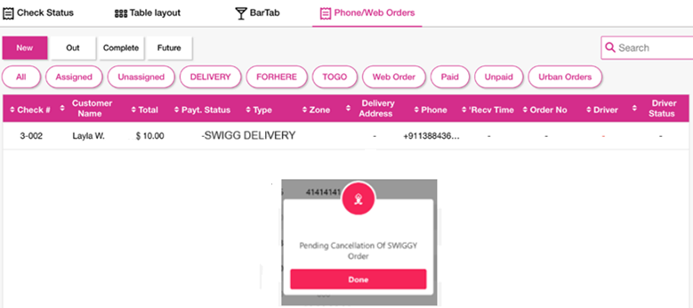 Once properly integrated, the Urban Piper option will appear in the Phone Order screen - same as Delivery. This applies to all tabs: New, Out, Complete, and Future. The name Urban Piper can be changed, as it is user-defined name (such as Urban Orders).
