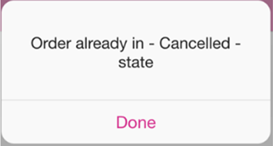 If an Order cannot be cancelled due to its Status: when attempting to cancel an Order, a notification pop-up appears with the message 'Order already in - [Status] - state'.