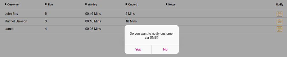 - If Yes is selected: the SMS message ‘Your reservation has been cancelled.’ will be sent to the Customer assigned to the Party.