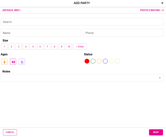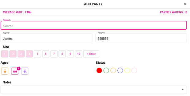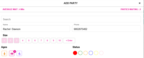 If Yes is selected: the Add Party pop-up appears. You can edit the Size, Status, Notes, and Timings. You cannot edit the Name and Phone Number.