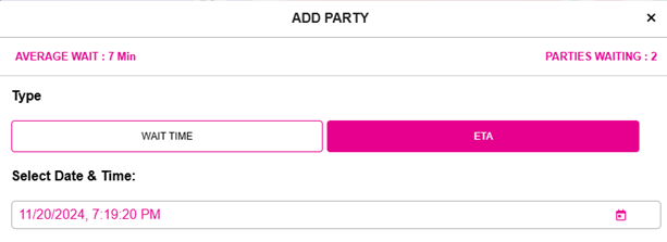 - ETA - If the Expected Time of Arrival toggle is enabled, you can select the date and time. This is for capturing when the Customer will be arriving to dine.