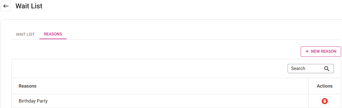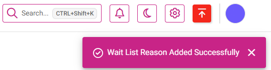 - When a Reason is successfully created and saved: you are returned to the Reason tab on the Wait List settings page, and the confirmation banner 'Wait List Reason Added Successfully' appears at the top-right.