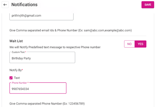 When the Wait List toggle is enabled (set to YES), you can send a predefined Custom Text to registered phone number or email. Enter the Custom Text in the box to be sent as the notification. The Notify By option will appear with Text checkbox, then enter the 9-digit Phone Number as a single string of numbers.