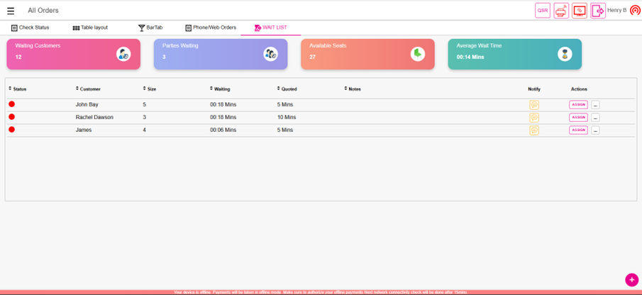 When the Point Of Sale (POS) is in offline mode, the Wait List feature will still function. You can still add a Wait List and customers in the wait list table will appear. Once a table is assigned, the system will remove the Customer from the Wait List and the edit option will also work.