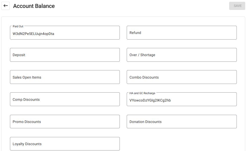 Paid Out, Refund, Deposit, Over/Shortage, Sales Open Items, Combo Discounts, Comp Discounts, HA and GC Recharge, Promo Discounts, Donation Discounts, and Loyalty Discounts.