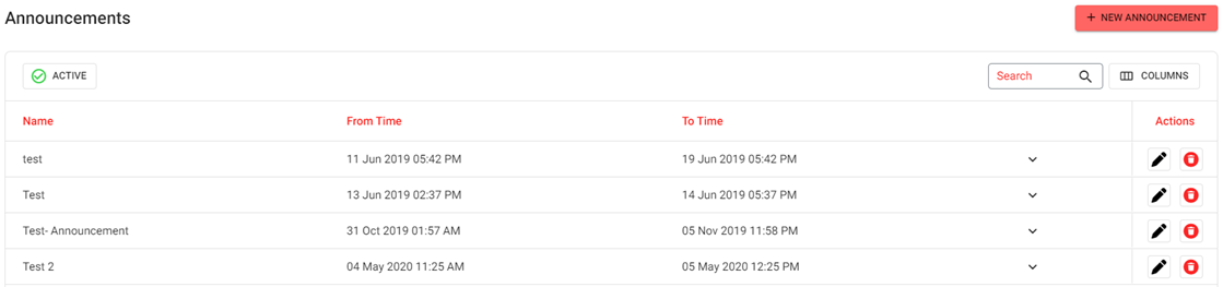 disabled by default and will be enabled (clickable) only when all mandatory fields have been filled-in. When clicked, you're returned to the main Announcements page where a confirmation appears. If a new Announcement was created, it will appear as a new row in the table.