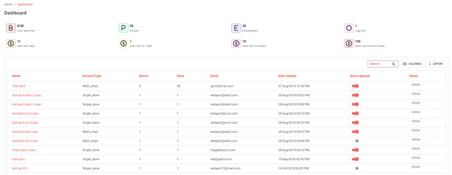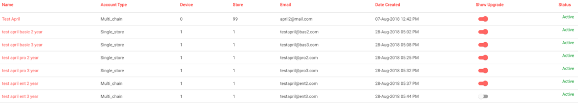 Device, Store, Email, Date Created, Show Upgrade and Status.