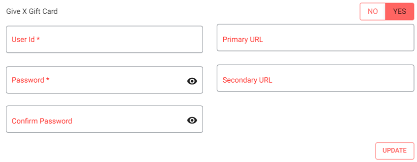 If the Give X Gift Card toggle is enabled, the following fields appear for providing Give X Gift Card information: