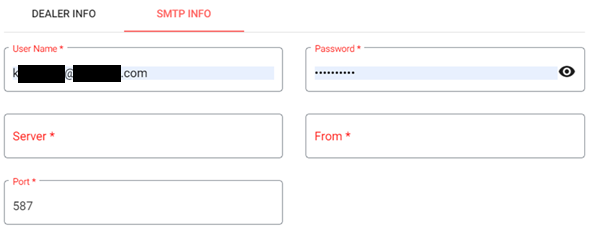 The Dealer Info page is broken down by the following tabs: Dealer Info (default) and SMTP Info.