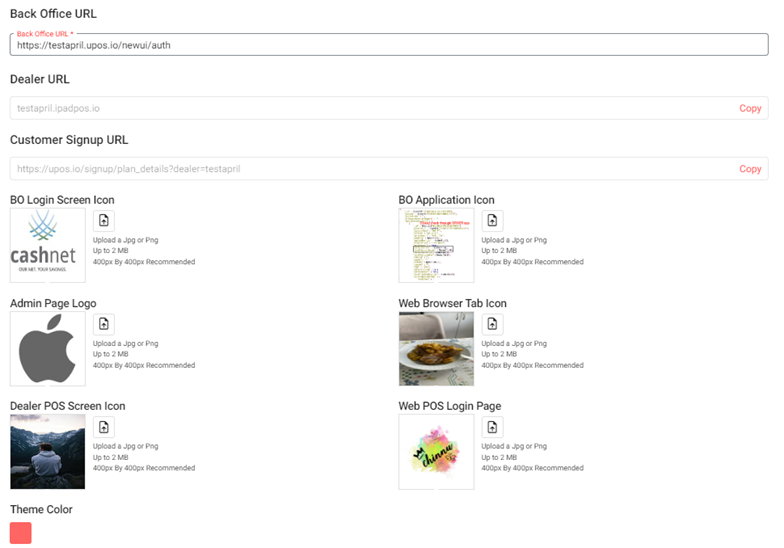 For the Icons/Logos (BO Login Screen, BO Application, Admin Page Logo, Web Browser Tab, Dealer POS Screen, and WebPOS Login Page): Click the Upload button (document with up arrow) to upload image from PC to represent the above options.