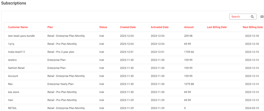 The Subscriptions page displays all subscribed customers in the form of a table with the following columns: