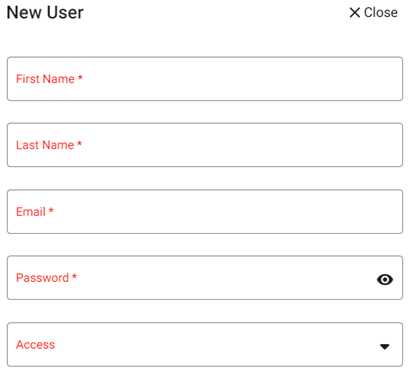 Click + New User to create a new Admin User, or click the corresponding Edit (pencil) to update an existing Admin User. The New/Update User pane appears: