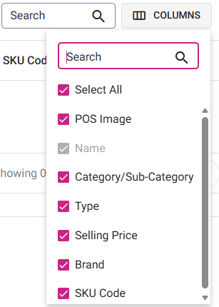 When a Columns button is clicked, a dropdown appears which displays all column headers on a page's table. You can select/deselect the columns to view. Any deselected option will be removed from the page and won't appear on any exported reports. Any grayed-out options are mandatory and must always be visible.