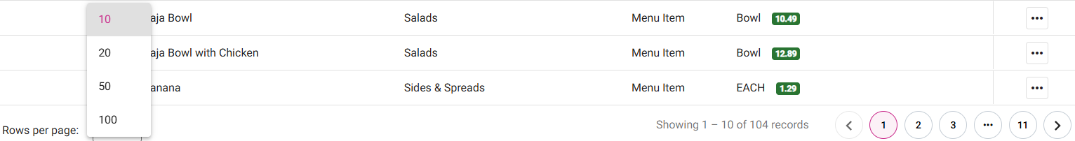 The pagination (rows per page) can be handled on any page with a multitude of results. You can set the Rows per page to be 10, 20, 50, or 100 based on the number of overall results. The number of pages will be based on the Rows per page selection. For the below example: 104 results broken up by 10 rows per page equals 11 pages of results.
