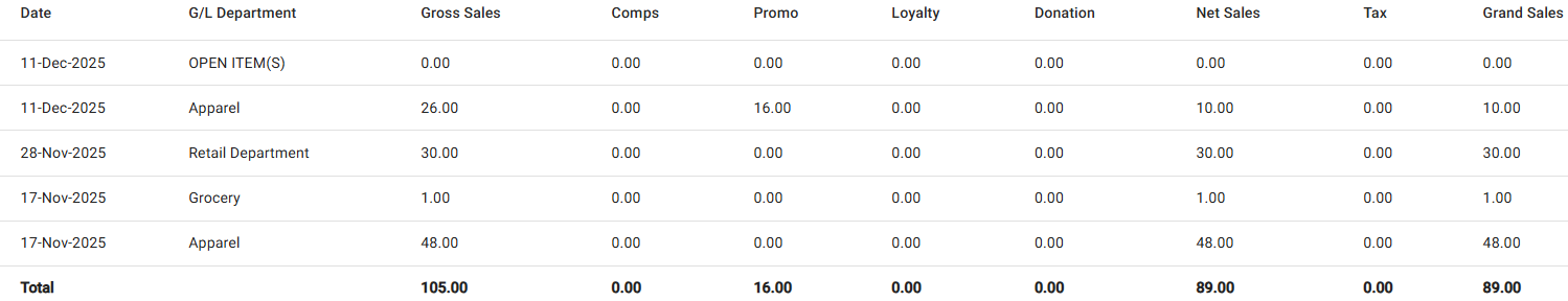 Grand Sales: The Total amount (in currency) of Net Sales + Tax for the department.