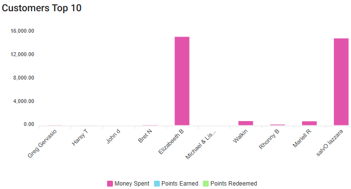 The Customers Top 10 chart shows the Names of the customers horizontally and their respective Points Earned, Money Spent and Points Redeemed vertically.