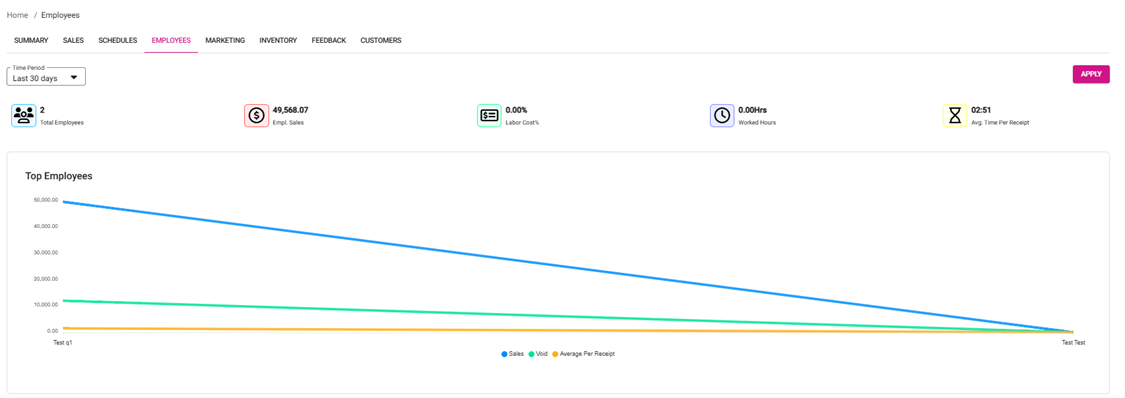 Select the Time Period from the dropdown, then click Apply. The Employees dashboard will appear for that selected date range. You will be able to view the below information, based on the selected Time Period: