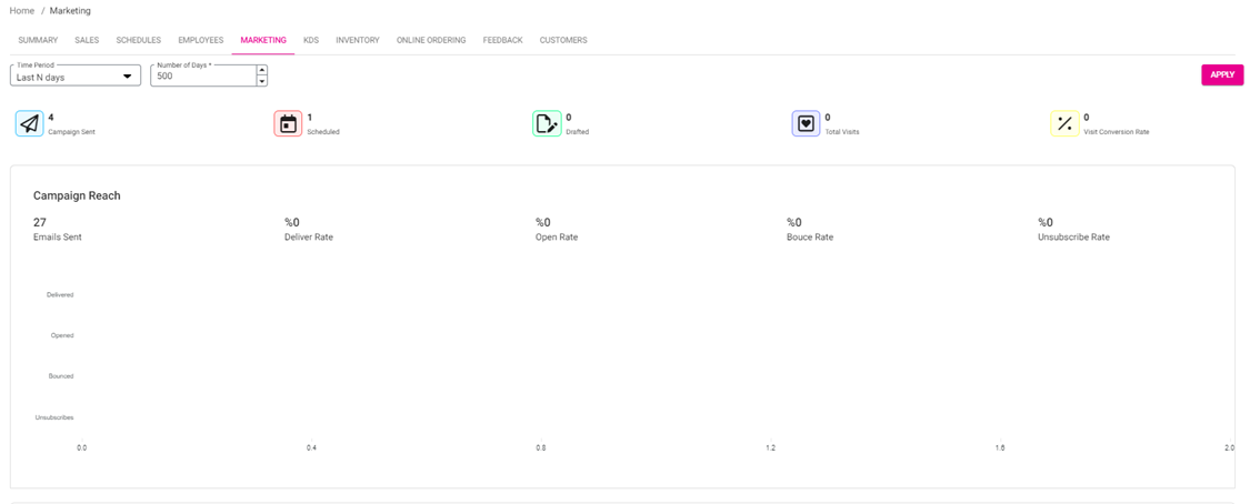 Select the Time Period from the dropdown, then click Apply. The Marketing dashboard will appear for that selected Time Period. You will be able to view the below information, based on the selected Time Period: